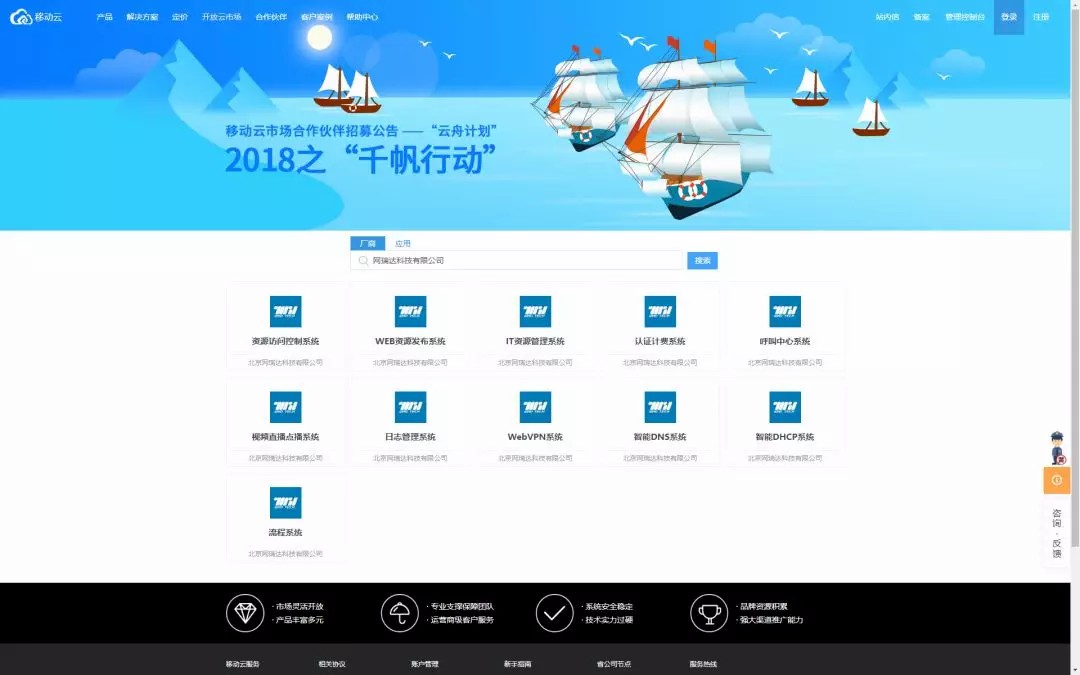 網(wǎng)瑞達結(jié)合市場特點及企業(yè)上云熱點,全方位擴展營銷渠道,精選11大IT運維管理系統(tǒng),通過了層層篩選與專家考核,成功入駐移動云的開放云市場。