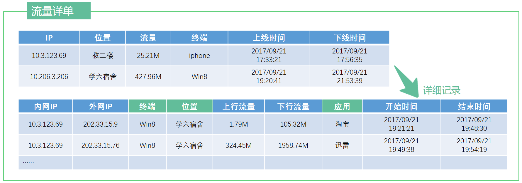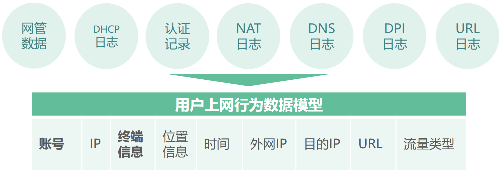 用戶進行網(wǎng)絡(luò)訪問的過程中會產(chǎn)生各類數(shù)據(jù),包括網(wǎng)管數(shù)據(jù)、DHCP 數(shù)據(jù)、DNS 數(shù)據(jù)、認證數(shù)據(jù)、NAT數(shù)據(jù)、URL 數(shù)據(jù)和DPI 數(shù)據(jù)等。但高校的IT 管理及支撐類系統(tǒng)數(shù)據(jù)管理性差,導(dǎo)致部分數(shù)據(jù)缺失;并且各系統(tǒng)數(shù)據(jù)分散存儲,無法統(tǒng)一管理;同時各類數(shù)據(jù)間缺乏關(guān)聯(lián),查找困難;因此目前高校難以實現(xiàn)統(tǒng)一的用戶網(wǎng)絡(luò)行為數(shù)據(jù)分析。