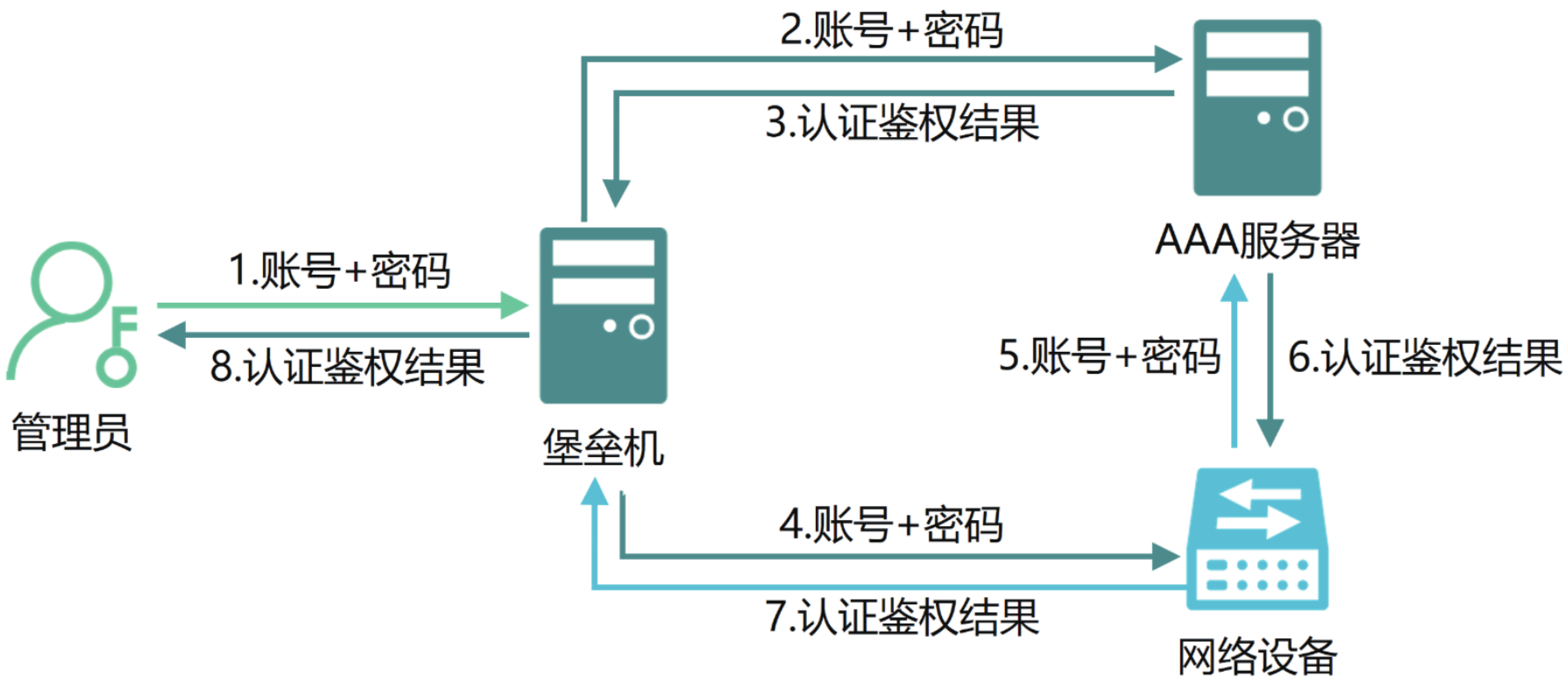 堡壘機(jī)與 AAA 服務(wù)器聯(lián)動(dòng),將堡壘機(jī)的認(rèn)證遷移到 AAA 服務(wù)器,管理員通過(guò)堡壘機(jī)訪問(wèn)網(wǎng)絡(luò)設(shè)備。